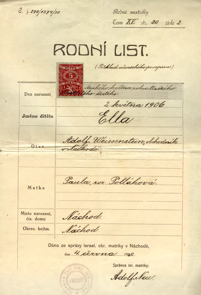This is the birth certificate of my mother, Ella Wernerova (nee Weissensteinova), who was born on 2nd May 1906 in Nachod. This birth certificate was preserved thanks to the fact that my parents had carefully hidden their documents before the war.