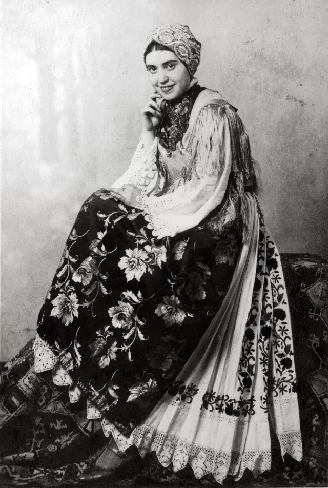 The dress that I am wearing on this photo is a traditional dress worn by women in Slavonia. It is very beautiful, with flowered design and nice colors, which unfortunately cannot be seen in this black-and-white photo.