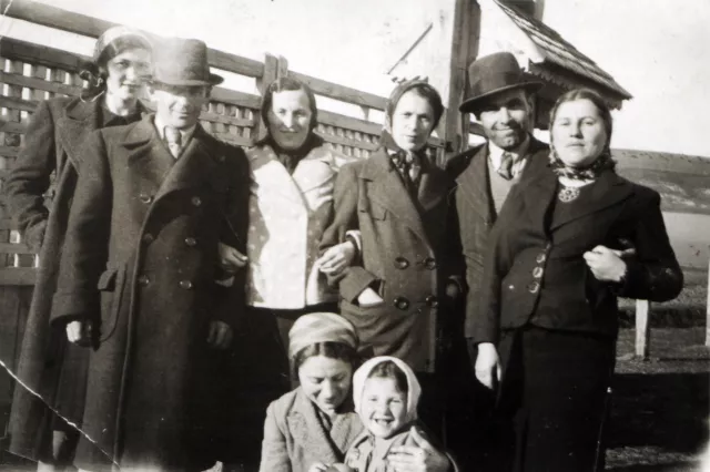 This picture shows from left to right: my sister, Iren Fulop, the Grunfeld couple, my sister, Margit, and the Markovics couple. In the front row: me, Elza Fulop, and the daughter of the Markovics?s. The picture was taken at the Aghiresu railway station, which was a sort of meeting place for the youth in Aghiresu in the 1930s. As there weren't too many possibilities for us to have fun, we would come here when trains were scheduled to pass by and weave at the passengers.