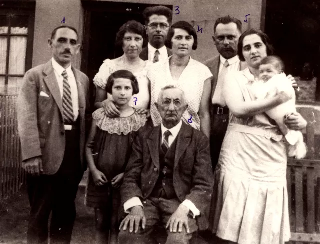 This is a photo of my father Albert Bozoky's family, taken in 1930, in Maglod, I think, near Budapest. If you look closely, someone numbered the persons in it. In the back row, starting from left, there are: Jakob Meier, his wife, Elena Meier - my father's sister; she has her arm around their daughter, my cousin, Alice Meier. Behind Elena there's a man whose name I don't remember, he was the husband of the woman standing in front of him: she was my father's sister, Rozalia, who lived in Targu Mures. Near Rozalia there is my father's brother, Emil Bozoky, and in front of him my mother, Johana Bozoky, with me in her arms. The man in the front row, sitting on the chair, is my paternal grandfather, Iosif Stein.