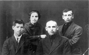 From left to right: my father Emil Potievskiy, his sister Rachel Glozman (nee Potievskaya) and my father's brothers Motl and Gedali, photographed on Rachel's birthday in Malin in the early 1920s.