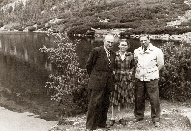 This picture was taken in 1947 somewhere near Zakopane, on the bank of a mountain lake. My boss from the Jewish Children’s Home in Krakow, Dawid Erdestein is standing on my right. I can not remember who the other man is. I met Erdestein by chance that day and we took that picture for a keepsake.