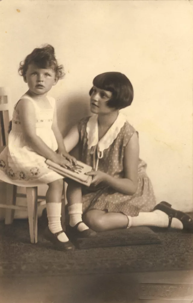 This picture was taken in Prague in 1931. This is a photograph of my sister Mimka (Emilie Bassova, nee Justizova) and I.