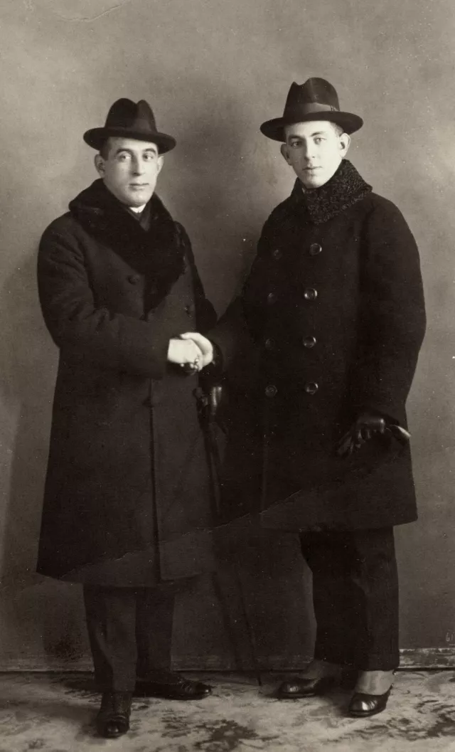 These are my mother's brothers. Emmanuel Grinberg is on the right and Joseph Grinberg is on the left. The picture was taken in the early 1920s in Jurbarkas.