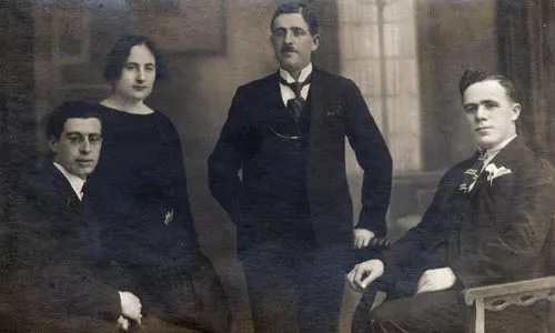 This is my parents' engagement: from left to right are my father Merkado Mois Natan, my mother Rebeka Avram Natan (nee Geron), her brother Yosif Avram Geron and friend Levi, who introduced them to each other. The photo was taken in Ruse, around 1922-23.