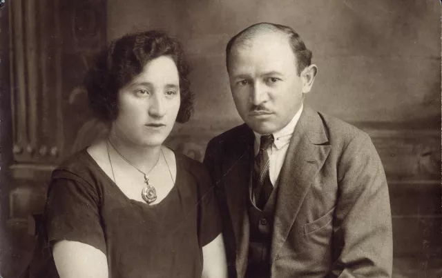 This is a picture from the engagement of my mother Rashel Levi (nee Pinkas) and my father Yosif Levi in 1926 in Vidin. The picture was taken in a studio. Its back is designed as a postcard. There is an inscription in ink: ‘Sofia, 10th June 1926 As a souvenir from our engagement which took place on 21st March 1926. Bakalov Mr. and Mrs. Yosif S. Pinkas’ The picture was sent to my uncle. There is no stamp of the photo studio. My father didn’t have his own home in Sofia. He married my mother by matchmaking. One of my aunts (Soultana – my mother’s sister) used to live in Sofia. She introduced my mother to my father and they married in 1926 .
