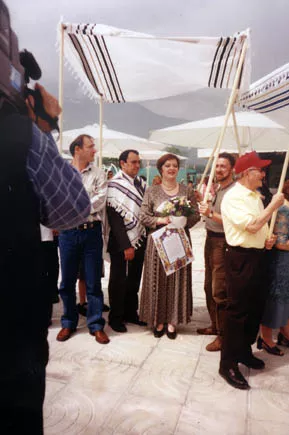 This is a religious collective wedding organized by the Joint, in which six couples from Sofia and Plovdiv, who had not been married according to the Jewish law, remarried. The event took place in Pancharevo. On the left is my daughter Ema, on the right is her husband Isak, who married before a registrar in 1975. The other participants in the ritual were Yosif and Mati Madzhar, Victoria and Mois Benbasat from Plovdiv and Reni and Robert Djerasi, Morits and Rozi Mashiyah and another couple from Sofia. We, from the Plovdiv 'Shalom' made three kilos of marzipan, which we took to the ritual. We filled two buses with people from Plovdiv and travelled to Sofia. On the back of the photo there is some writing in pen: ‘Emi and Izako – religious wedding 15.05.2002.’