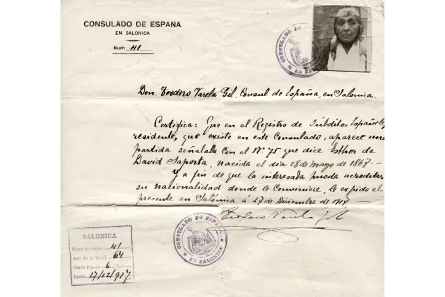 Ester Saporta's nationality certificate from the Spanish Consulate of Salonica