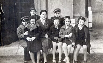 This is the first grade of the Jewish gymnasium in Tallinn. We were photographed after classes near the gymnasium. 1st row, from left to right: Harry Hoff, Fanny, our teacher Basia Shneiberg, me, Dora Vigderhaus and Frieda Slomka. Standing in the 2nd row are Libert Kantor and Donald Dubrovkin. This photo was taken in 1939.