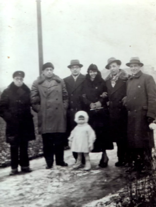 This is the first husband of father's sister Zelda, Sinder, with my father's brother Samuel Ferdmann and his wife Mira. The first to the right is father's brother Mikhail Ferdmann. I do no know the other two men in this picture. They were probably some pals. I am standing in the front. The picture was taken in Narva in 1937 during a walk.