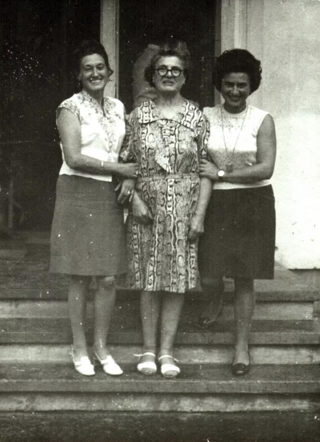 This photo was taken here, in Brasov, in 1985; it was right in front of the staircase of the apartment block I still live in. You can see in it, from left, my cousin Etus Gendler, nee Goldstein my mother Rifke Feld, nee Friem, and me. We had this picture taken when my cousin came to visit us.