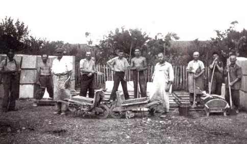 This is a photo of my father, Eugen Kohn, when he was doing forced labor in Tinca, where they manufactured cement and concrete tiles. He's the fourth from the right. This picture was taken in 1942.