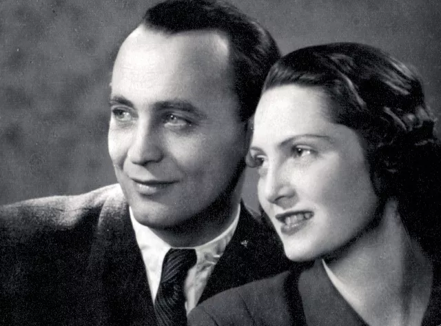 This photo was taken right after my wedding in 1945 in Miskolc. I am on the right and my husband Pal Vari, then still Weitzenfeld, on the left.