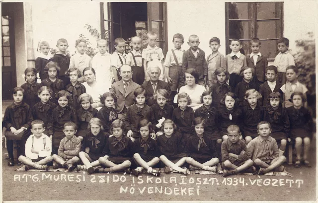This is a picture of my father, Jeno Moskovits, me and my classmates of the Jewish elementary school in Marosvasarhely. It was taken in 1934 when I finished the first grade. I don't know how this picture survived.