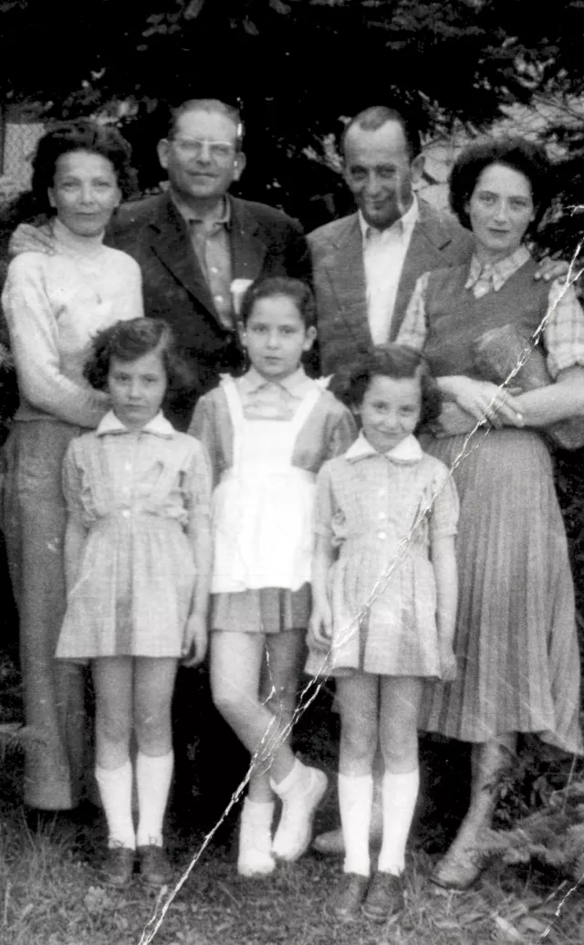 This is a family photo from 1955 or 56. It was taken in Budapest. I like this photo especially because my parents are still on it. I am first from left, next to me is my husband Pal Vari. Next to him are my parents Laszlo and Margit Ladanyi. And in front ot us are my three children, Zsuzsa in the middle and the twins, Judit and Agnes on the two sides.