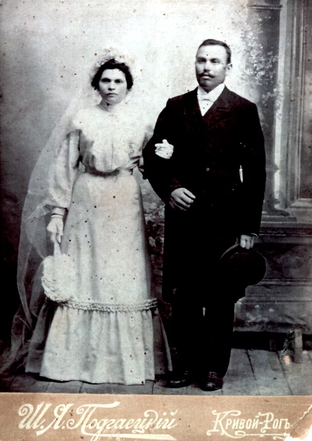 My maternal grandmother and grandfather Zlata Bragher and Moisey Bragher photographed on the day of their wedding in Krivoy Rog in 1905. Podgaevski photo studio.