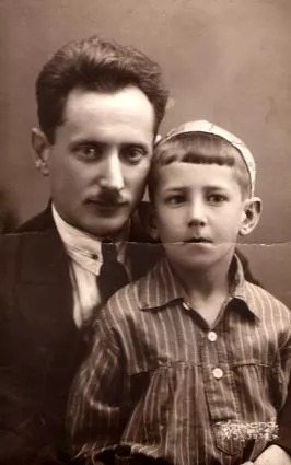 This is my father Moisey Kotin and me. Father took me to the photographer and had my picture taken for the family album. The photograph was made in Moscow in 1932.