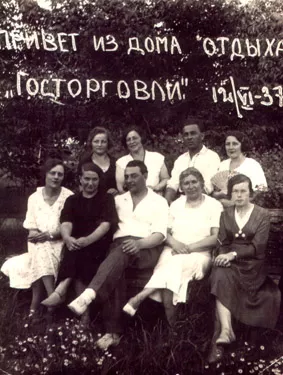 My uncle, my mother's brother Faivish Minkovetskiy (standing, 2nd on the right), sent us this photo from a recreation house. He was awarded this trip at work. This photo was taken in Odessa in 1937.