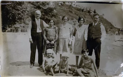 This photograph was taken in Altinkum, how old am I here? It is around 1925-1926. From the left, my father, my mother, an acquaintance of my father, I do not know who, these are the Frunkins, my father’s friends. I am the child in front on the very right, the others are the son of the Frunkins and my older sister.