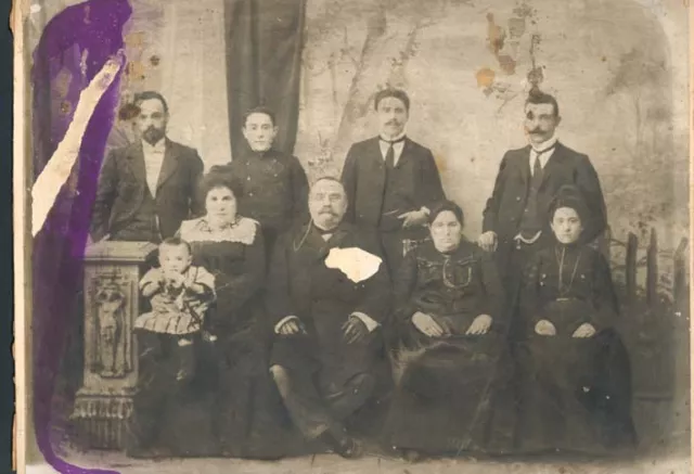 This photo is made in 1903-1904. In the first row sits my great-grandfather Moisei Eiderman. To the left of him is his daughter - Grandmother's sister Vera Moiseevna, Zlobinsky after marriage, with her son in her lap - Abram Isaevich Zlobinsky. Near the bedside-table is his father Isai (or Shaya) Abramovich Zlobinsky. Second from the left in the top row is Grandmother's youngest brother David Moiseevich Eiderman. Next to him - Iosif Moiseevich Eiderman, the second brother. Great-grandmother sits to the right of great-grandfather. To the right of her is her daughter, my grandmother Rachel Moiseevna; behind her stands her husband Lev Markovich Golshmid. (The photo is done in Saint Petersburg, in the artistic studio in 64 Sadovaya Street, near Nikolski Bridge - as appears from the seal on the back).