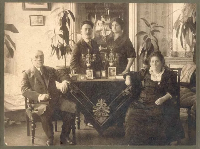 From the inscription to this photo, presented by my great-grandfather and great-grandmother to one of their daughters - "In the 59th year of their life" - in April 15, 1913, it is easily to calculate the year of birth of both Moisey Eiderman and his wife [name unknown] - 1854. The photo is taken at their home in Saint Petersburg. Behind them standing are their younger son David with his wife Eva. Uncle David was later paralyzed and spent several years in bed. He was red-haired, very cheerful, very kind, very witty man, always the soul of the company. And he remained such even in this hard situation. And Aunt Eva in her youth was a very beautiful woman, surprisingly beautiful, and in her old age she had an attractive appearance, too (she died, probably, in the 1960s). Aunt Eva and Uncle David had three children. Two sons died in the Great Patriotic War. Sasha was wounded, he was treated in a hospital in Syzran, they sent parents a telegram - and Aunt Eva went there, but had not found him alive. And the second son Misha died as a soldier of the irregular people's army, near Leningrad, in Nevskaya Dubrovka. Their younger daughter, Sophia Davidovna, is in America now, she is old already, born in 1926.