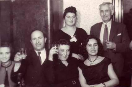 This is at a family party, I believe it was at the wedding of my cousin Izu Davidsohn. I, Ietti Leibovici, am the one sitting on the chair on the right, a cousin of mine, a more distant relative, is sitting on my left - her name was Eva, but I forget her family name just now - with her husband and daughter. They lived in Bucharest, but Eva died very many years ago. My cousin Anuta Manas is in the back, and the one on her right is one of my in-laws - a cousin of mine, Izu Davidsohn, is married to Anuta's daughter -, his name was Herman Schwartz. The photograph was taken in Bucharest around 1956.