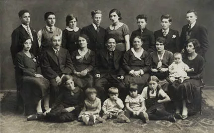 Sitting from left to right in the middle row are: Sara, my father's sister-in-law: wife of uncle Mordo Pilosof, then comes my father Leon Pilosof, my mother Tamara Pilosof (nee Konfort), my grandfather Sabat Pilosof, my grandmother Lea Pilosof (nee Astrug), Regina Mordoch - my father's sister, Buka Pilosof, my father's sister-in-law and wife of uncle Mois Pilosof with their child Sabat.