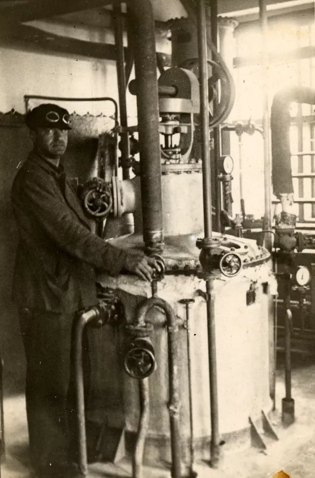 This is my husband Fayvel Teytelbaum at work, at the soap making factory, by some machine, Vilkaviskis, 1937.