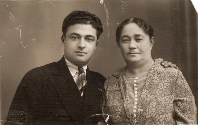 These are my husband Fayvel and his mother Riva Teytelbaum. The picture was taken in the 1930s, Vilkaviskis, Nitsevich photo studio.