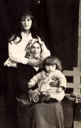 This photo was taken at photographer’s parlor ‘Modern’ owned by Veinstraub in Vad-Rashkov. My great-grandmother Haya is sitting in the center. My mother's sister Feiga is standing, my uncle Leib's daughter, Ida Lerner, is sitting on Haya's lap. The picture was taken in 1925.