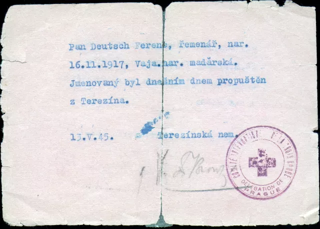 Ferenc Deutsch's liberation certificate from Theresienstadt