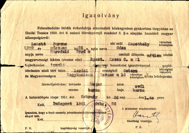 My mother, who had been a party member for a long time, since 1945 (and this was in 1951, in January perhaps), went to the party secretary of the town and told him what the problem was. He said that it was quite dangerous, because those who came home from abroad were usually caught, but in the previous year on the 1st May I was at the 1st May march in Israel, where the company where I belonged to carried the pictures of Stalin and Lenin with a red flag and a communist banner in Hebrew. And I had sent home earlier the picture which was taken there, and my mother showed it to them so that they would see what my opinion was. Then they went with this to some local or other authority with the party secretary. It didn't even take 10 days and I got the notification that I was free to go home. I got a free ticket from the Hungarian embassy in Israel, the Polish ship called Bathori took be to Constanta [today Romania], and from there I came to Hungary by train, and I went home by train to my parents in Nagykanizsa.