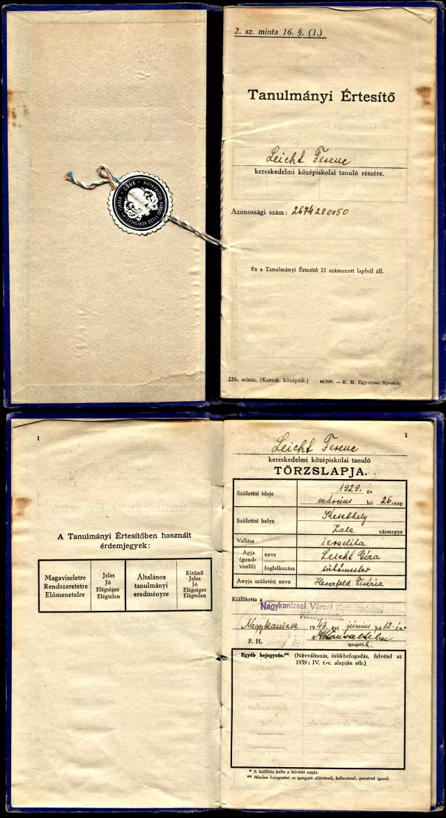 In 1939, at the age of 10, I applied to the Piarist high school in Nagykanizsa. They enrolled 5 Jewish children, but they didn't enroll me as the 6th. This was overzealous from their part, because the anti-Jewish laws only limited the number of those who could be enrolled at universities, and I never forgave them for this. So I only went to middle school. After middle school, from 1943 I went to a commercial college for a year in Nagykanizsa. I didn't have to take any entrance exams, because I was such a good student that there was no need for it. The schools published a year book every year with the list of all the pupils and their grades for each subject. The names of those who graduated with distinction was printed with italics, and the names of those who were excellent with bold letters. I knew the general subjects better, I was first at school in Mathematics, but for example I was never good at drawing, handcrafts, physical exercise and singing. I always had a problem with arts and crafts, and these spoilt my grade average. I was a good student at the commercial school, too. I never studied at home, I read very much, but at home I never did the homework, which I couldn't do at school. I had just finished the 1st grade, when the Germans marched in on the 19th March 1944. By the 31st March all schools had to be closed, they closed all the schools.