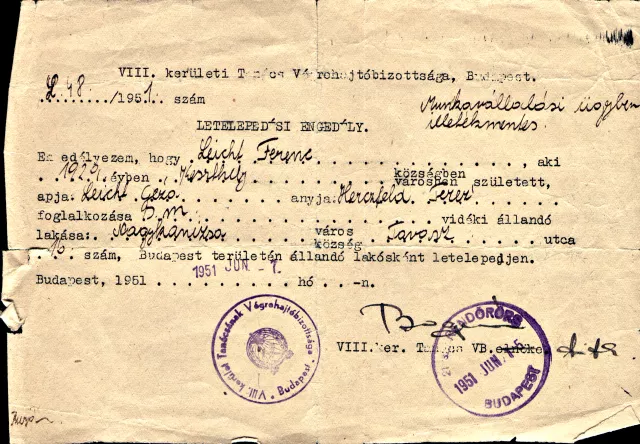I applied for this residing permission at the order of my future workplace, when I returned from Israel in 1951 to Hungary, and I wanted to move to Budapest. At that time one could only move to the capital and get a job with such a permit. [Editor's note: Because of the migration to Budapest and housing shortage of large dimensions the executive council limited the settling in a decree in 1951. Only those could get a permission to reside who could prove that their labor relations, studies or family circumstances justified their permanent residence in Budapest.]