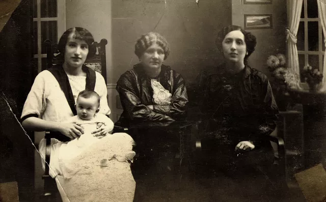 My mother and my sister Sari, and next to them my grandmother and another woman. My father met the young lady who became my mother on a train trip. My mother was sitting in the train with my grandmother and he sat beside them. That must have been in 1910 or 11. Right there on the train they decided to get married. The actual wedding ceremony in the temple followed in 1912 in Sopron. After the wedding he immediately took my mother to Veszto, where they lived in a family house, an official residence, secured by the Savings Bank. My father died in 1915. My mother found work as a clerk at the local administration center. Most of the time I was looked after by my aunt, who moved in with us after my father did not come back from the war. I was practically raised by her. My sister Sari was born in 1913. She was eleven months older than me.