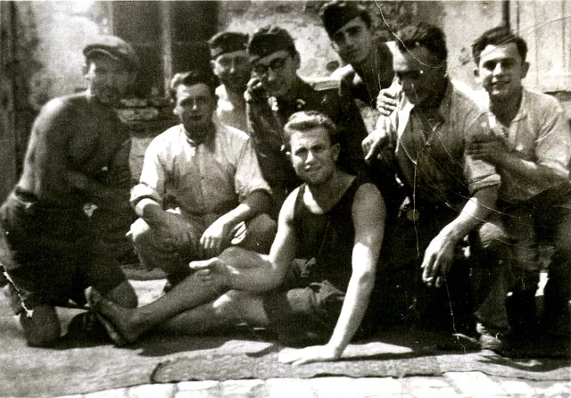 This picture was taken in 1943 in Hodmezovasarhely during work service. First from the left is Hermann Fischer, who settled in Australia. He a resident of Kolozsvar, but since the Hungarians annexed it back [see: second Vienna decision], he was called up for work service. Second from the left, I don’t recall his name, he was a member of the skeleton staff at the camp. The situation hadn’t gone so wild yet and in the beginning they treated us well. The first from the right was Tibor Kalan, he just died three or four years ago. All I know about him was that he lived on Rozsadomb. Then comes Laszlo Pollak, he’s also here. This was a boy from Szeged, he was the director of the Szeged congregation, he just died a year ago. The whole group ended up in Bor, except for me. Those who were commanded to go there, had nothing more to hope for. Those I mentioned in the picture were the lucky ones. Though they went to Bor, they struggled out successfully.