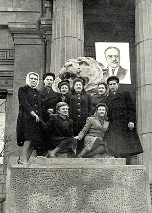 This is a picture of me (third on the left) and my group of friends. We were photographed next to the lion statue at the Museum of Ukrainian Art (with a portrait of Molotov) in Kiev in November 1948.