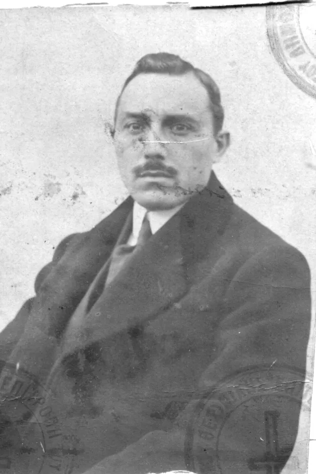 This is my father Iosif but everybody called him Pepo Florentin. This picture must have been taken before I was born because he had shaved off the mustache by then. I think it is probably a passport or identity card picture because it seems like it has been torn from a document and it has a stamp from the 'Thessaloniki Council.'