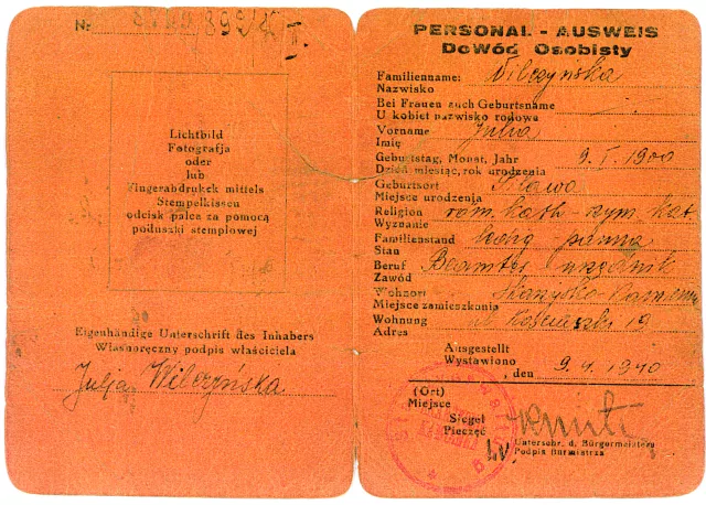 This is the fake ‘Kennkarte’ [identification document used under German ocupation] of my Mom, Stefania Krasucka, issued under the false name of Julia Wilczynska. The document was issued in 1940.