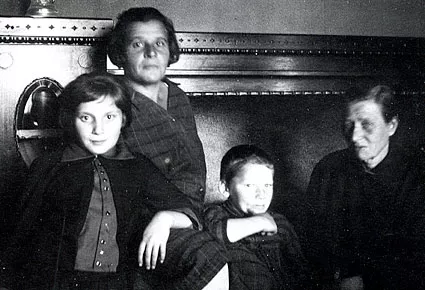 My brother Leo Khatset took this photo of us in the dining room in our apartment on my father's birthday. We are waiting for my father to come home from work. From left to right: I, Frida Khatset; my mother Nehama Khatset; my brother Boris Khatset; our governess Olga that had a Freel school diploma. Kiev, 1931.