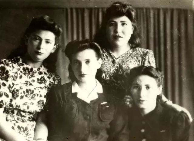 This is me sitting first from the right, with my school friends. The girl from the left wearing a colorful dress is Zina Fihrer, she lives in Israel. She one in the center, she has a white collar, is Klara, she also lives in Israel, standing on the right is my friend Polia, she lives in America. These girls were in the ghetto in Bershad and survived. This photo was taken in Bershad in 1946, when we were in the 10th form.