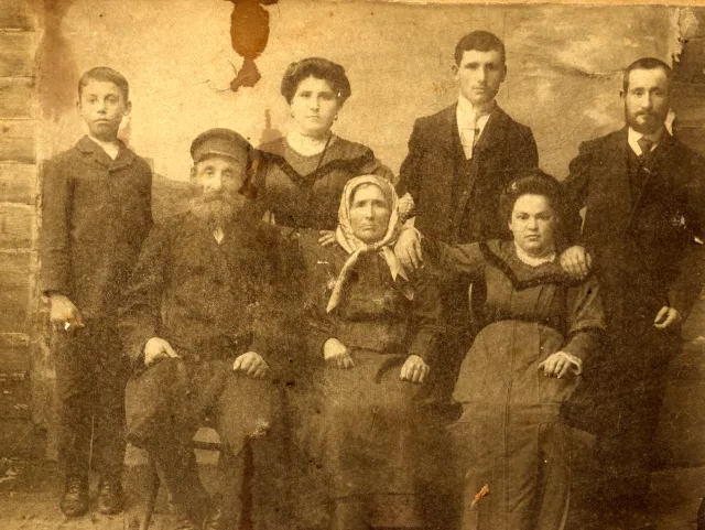 This is my mother's family photo. In the center is grandmother Roiter wearing a kerchief, beside her is grandfather Iosif Roiter. The first from the right is my mother's brother, whose name I do not remember, beside him is her younger brother Ehil Roiter, sitting is my mother older brother's wife. In the center is my mother Elka Roiter. The little boy is my mother sister Sura's son, whose name I do not remember. This photo was taken in Chechelnik some time around 1916.