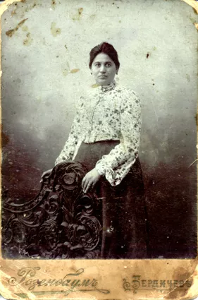 This is my mother Revekka Winner. This photo was taken in Berdichev where she was visiting, in the Rozenbaum photo shop in 1916. I always had this photo with me. I had it in my note book that I ad in evacuation with me and so it has been preserved.