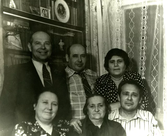 Standing: my brothers Igor and Boris, my wife Dora. This photo was taken in Slutsk, at Mama's home, when we visited her, in 1980.