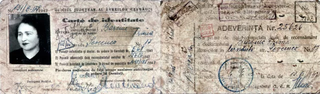 This is the identity card, issued by the Romanian occupational authorities to my mother Frima Bursuk, nee Derman, in Chernovtsy in 1942.