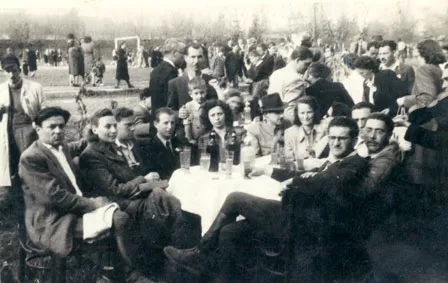 This was some sort of gathering, Jews from Des are sitting at the table, this must have been in 1945 or 1946, after they came home from deportation. I don’t know all of them, my husband Fulop Grossmann is there too, that’s why I kept this photo. My husband is the one who is standing in center, behind that boy. The person sitting on the left side is Hersi Samuel, next to him is his sister, the fifth from left, before the boy is Edit Horak.