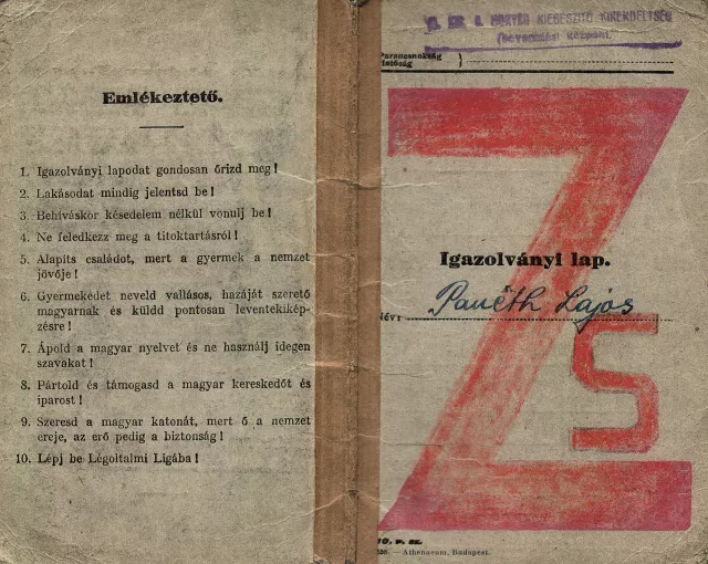 This is a certificate that my father received from the army when he was drafted in 1942. The big ?ZS" which is red in the original, showed that he was a Jew. The word for Jew in Hungarian is zsido.
