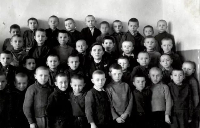 This is a picture of the kindergarten my son, Roman Natov, attended in evacuation. My son is in the middle of the first row. The photo was taken in Pervouralsk in 1943.