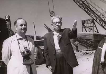 This is my husband, Genrich Zimanis (on the left with a camera), at some construction site. The photo was taken in the early 1950s in Vilnius. He was an inspector of the Central Committee of the Communist Party.