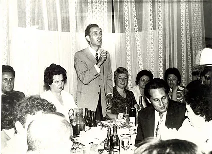 This is my husband Yevgeniy Grinblat (standing in the center) and I Gherda Kagan (sitting on the right) at a meeting with his former co-students. This photo was made in Odessa in 1974. On the left sitting my friend Nadezhda Furman. Her husband Yakov Furman is beside her, they both live in Los Angeles now. The man on the right in the center is Leonid Goldenberg, deceased. This meeting organized my husband and he conducted it himself.